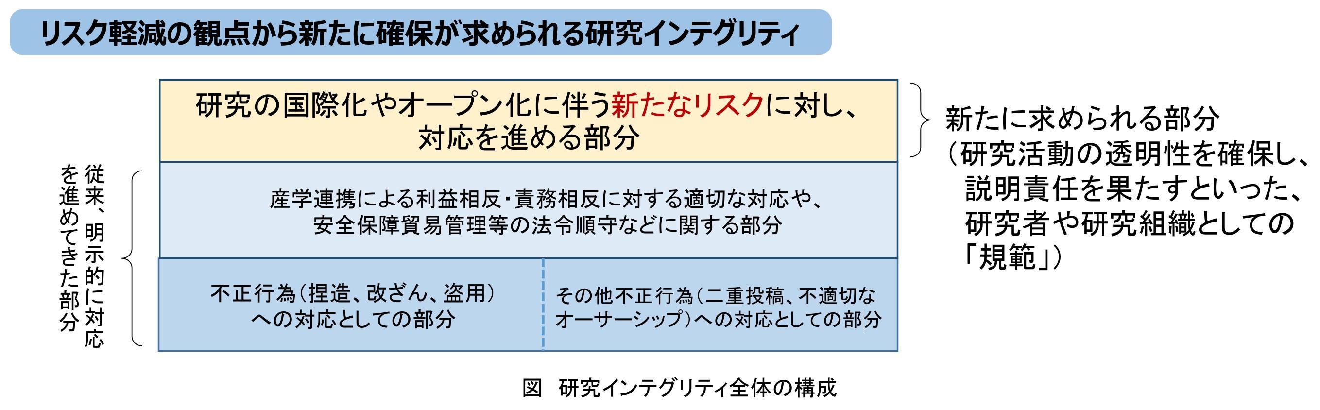 研究インテグリティとは、研究の国際化・オープン化が進展する中、研究機関・研究者等が社会の負託(資金、信頼など)を受けて行う活動について、自主的・自律的に担保すべき健全性・公正性を意味します。これは、従来の研究公正(不正防止)にとどまらず、近年顕在化している国際連携に伴う新たなリスク(開放性、公正性、透明性の損失や研究者の意図せぬ利益相反・責務相反に陥る危険性)に対応することが求められています。